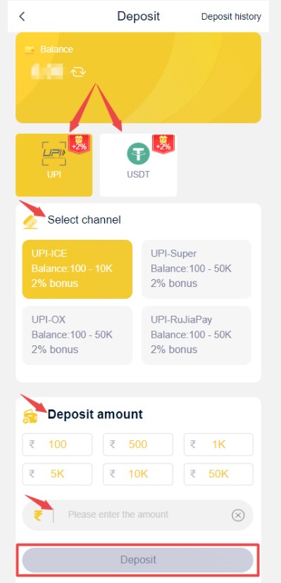 - Click the deposit button, and we have two methods to make a recharge (UPIPAY and USDT)