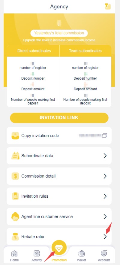 - If you have a downline or referral member, use your own link to register, and if they make a recharge, you can claim a rebate. The agent will get a minimum commissionof 07.% (level 1) and 0.75% (level2) from each transaction that is done by the referral(added every day at 01.00 AM). Each game has a different percentage, which you can check on the Promotion menu to check , and sports do not count towards the rebate